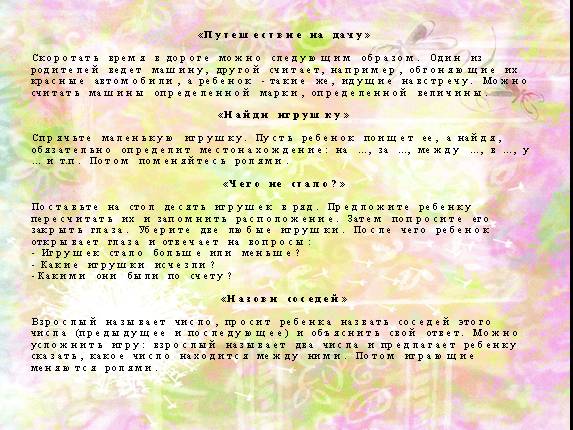 Скоротать время в дороге можно следующим образом. Один из родителей ведет машину, другой считает, например, обгоняющие их красные автомобили, а ребенок - такие же, идущие навстречу. Можно считать машины определенной марки, определенной величины.