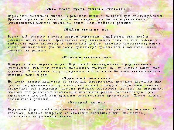 Взрослый называет число, а ребенок должен назвать три последующих. Другие варианты: назвать три последующих числа и увеличить (уменьшить) каждое число на один. Поменяйтесь ролями.