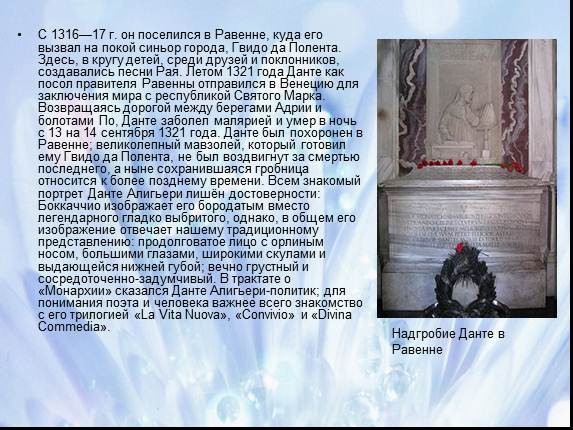 С 1316—17 г. он поселился в Равенне, куда его вызвал на покой синьор города, Гвидо да Полента. Здесь, в кругу детей, среди друзей и поклонников, создавались песни Рая. Летом 1321 года Данте как посол правителя Равенны отправился в Венецию для заключения мира с республикой Святого Марка. Возвращаясь дорогой между берегами Адрии и болотами По, Данте заболел малярией и умер в ночь с 13 на 14 сентября 1321 года. Данте был похоронен в Равенне; великолепный мавзолей, который готовил ему Гвидо да Полента, не был воздвигнут за смертью последнего, а ныне сохранившаяся гробница относится к более позднему времени. Всем знакомый портрет Данте Алигьери лишён достоверности: Боккаччио изображает его бородатым вместо легендарного гладко выбритого, однако, в общем его изображение отвечает нашему традиционному представлению: продолговатое лицо с орлиным носом, большими глазами, широкими скулами и выдающейся нижней губой; вечно грустный и сосредоточенно-задумчивый. В трактате о «Монархии» сказался Данте Алигьери-политик; для понимания поэта и человека важнее всего знакомство с его трилогией «La Vita Nuova», «Convivio» и «Divina Commedia».