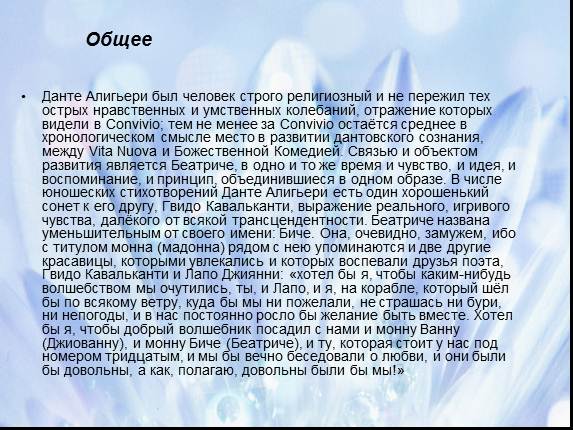 Данте Алигьери был человек строго религиозный и не пережил тех острых нравственных и умственных колебаний, отражение которых видели в Convivio; тем не менее за Convivio остаётся среднее в хронологическом смысле место в развитии дантовского сознания, между Vita Nuova и Божественной Комедией. Связью и объектом развития является Беатриче, в одно и то же время и чувство, и идея, и воспоминание, и принцип, объединившиеся в одном образе. В числе юношеских стихотворений Данте Алигьери есть один хорошенький сонет к его другу, Гвидо Кавальканти, выражение реального, игривого чувства, далёкого от всякой трансцендентности. Беатриче названа уменьшительным от своего имени: Биче. Она, очевидно, замужем, ибо с титулом монна (мадонна) рядом с нею упоминаются и две другие красавицы, которыми увлекались и которых воспевали друзья поэта, Гвидо Кавальканти и Лапо Джиянни: «хотел бы я, чтобы каким-нибудь волшебством мы очутились, ты, и Лапо, и я, на корабле, который шёл бы по всякому ветру, куда бы мы ни пожелали, не страшась ни бури, ни непогоды, и в нас постоянно росло бы желание быть вместе. Хотел бы я, чтобы добрый волшебник посадил с нами и монну Ванну (Джиованну), и монну Биче (Беатриче), и ту, которая стоит у нас под номером тридцатым, и мы бы вечно беседовали о любви, и они были бы довольны, а как, полагаю, довольны были бы мы!»