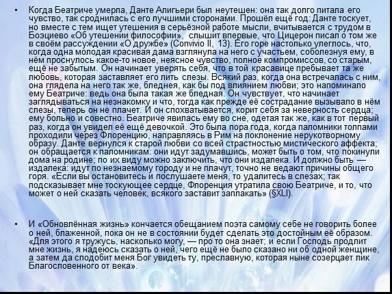 И «Обновлённая жизнь» кончается обещанием поэта самому себе не говорить более о ней, блаженной, пока он не в состоянии будет сделать это достойным её образом. «Для этого я тружусь, насколько могу, — про то она знает; и если Господь продлит мне жизнь, я надеюсь сказать о ней, чего ещё не было сказано ни об одной женщине, а затем да сподобит меня Бог увидеть ту, преславную, которая ныне созерцает лик Благословенного от века».