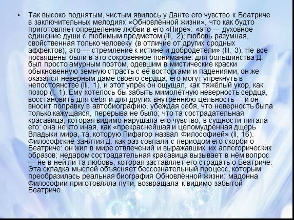 Так высоко поднятым, чистым явилось у Данте его чувство к Беатриче в заключительных мелодиях «Обновлённой жизни», что как будто приготовляет определение любви в его «Пире»: «это — духовное единение души с любимым предметом (III, 2); любовь разумная, свойственная только человеку (в отличие от других сродных аффектов); это — стремление к истине и добродетели» (III, 3). Не все посвящены были в это сокровенное понимание: для большинства Д. был просто амурным поэтом, одевшим в мистические краски обыкновенную земную страсть с её восторгами и падениями; он же оказался неверным даме своего сердца, его могут упрекнуть в непостоянстве (III, 1), и этот упрёк он ощущал, как тяжёлый укор, как позор (I, 1). Ему хотелось бы забыть мимолётную неверность сердца, восстановить для себя и для других внутреннюю цельность — и он вносит поправку в автобиографию, убеждая себя, что неверность была только кажущаяся, перерыва не было; что та сострадательная красавица, которая видимо нарушала его чувство, в сущности питала его: она не кто иная, как «прекраснейшая и целомудренная дщерь Владыки мира, та, которую Пифагор назвал Философией» (II, 16). Философские занятия Д. как раз совпали с периодом его скорби о Беатриче: он жил в мире отвлечений и выражавших их аллегорических образов; недаром сострадательная красавица вызывает в нём вопрос — не в ней ли та любовь, которая заставляет его страдать о Беатриче. Эта складка мыслей объясняет бессознательный процесс, которым преобразилась реальная биография Обновлённой жизни: мадонна Философии приготовляла пути, возвращала к видимо забытой Беатриче.