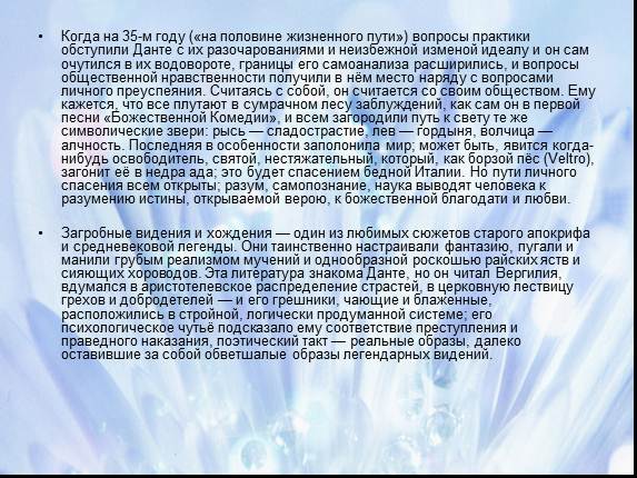 Загробные видения и хождения — один из любимых сюжетов старого апокрифа и средневековой легенды. Они таинственно настраивали фантазию, пугали и манили грубым реализмом мучений и однообразной роскошью райских яств и сияющих хороводов. Эта литература знакома Данте, но он читал Вергилия, вдумался в аристотелевское распределение страстей, в церковную лествицу грехов и добродетелей — и его грешники, чающие и блаженные, расположились в стройной, логически продуманной системе; его психологическое чутьё подсказало ему соответствие преступления и праведного наказания, поэтический такт — реальные образы, далеко оставившие за собой обветшалые образы легендарных видений.