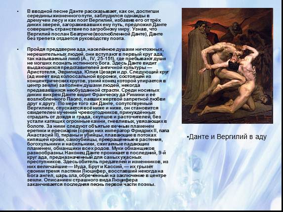 Пройдя преддверие ада, населённое душами ничтожных, нерешительных людей, они вступают в первый круг ада, так называемый лимб (А., IV, 25-151), где пребывают души не могших познать истинного бога. Здесь Данте видит выдающихся представителей античной культуры — Аристотеля, Эврипида, Юлия Цезаря и др. Следующий круг (ад имеет вид колоссальной воронки, состоящей из концентрических кругов, узкий конец которой упирается в центр земли) заполнен душами людей, некогда предававшихся необузданной страсти. Среди носимых диким вихрем Данте видит Франческу да Римини и её возлюбленного Паоло, павших жертвой запретной любви друг к другу. По мере того как Данте, сопутствуемый Вергилием, спускается всё ниже и ниже, он становится свидетелем мучений чревоугодников, принуждённых страдать от дождя и града, скупцов и расточителей, без устали катящих огромные камни, гневливых, увязающих в болоте. За ними следуют объятые вечным пламенем еретики и ересиархи (среди них император Фридрих II, папа Анастасий II), тираны и убийцы, плавающие в потоках кипящей крови, самоубийцы, превращённые в растения, богохульники и насильники, сжигаемые падающим пламенем, обманщики всех родов. Муки обманщиков разнообразны. Наконец Данте проникает в последний, 9-й круг ада, предназначенный для самых ужасных преступников. Здесь обитель предателей и изменников, из них величайшие — Иуда, Брут и Кассий, — их грызёт своими тремя пастями Люцифер, восставший некогда на Бога ангел, царь зла, обречённый на заключение в центре земли. Описанием страшного вида Люцифера заканчивается последняя песнь первой части поэмы.