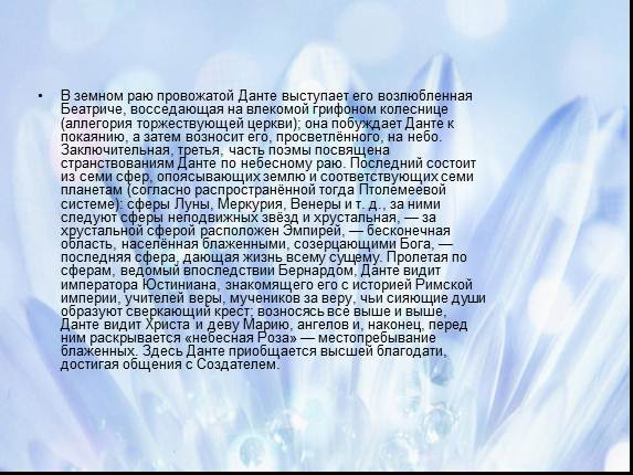В земном раю провожатой Данте выступает его возлюбленная Беатриче, восседающая на влекомой грифоном колеснице (аллегория торжествующей церкви); она побуждает Данте к покаянию, а затем возносит его, просветлённого, на небо. Заключительная, третья, часть поэмы посвящена странствованиям Данте по небесному раю. Последний состоит из семи сфер, опоясывающих землю и соответствующих семи планетам (согласно распространённой тогда Птолемеевой системе): сферы Луны, Меркурия, Венеры и т. д., за ними следуют сферы неподвижных звёзд и хрустальная, — за хрустальной сферой расположен Эмпирей, — бесконечная область, населённая блаженными, созерцающими Бога, — последняя сфера, дающая жизнь всему сущему. Пролетая по сферам, ведомый впоследствии Бернардом, Данте видит императора Юстиниана, знакомящего его с историей Римской империи, учителей веры, мучеников за веру, чьи сияющие души образуют сверкающий крест; возносясь все выше и выше, Данте видит Христа и деву Марию, ангелов и, наконец, перед ним раскрывается «небесная Роза» — местопребывание блаженных. Здесь Данте приобщается высшей благодати, достигая общения с Создателем.