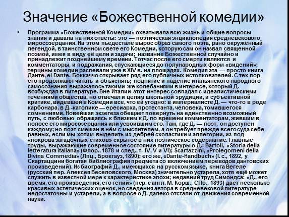 Программа «Божественной Комедии» охватывала всю жизнь и общие вопросы знания и давала на них ответы: это — поэтическая энциклопедия средневекового миросозерцания. На этом пьедестале вырос образ самого поэта, рано окружённый легендой, в таинственном свете его Комедии, которую сам он назвал священной поэмой, имея в виду её цели и задачи; название Божественной случайно и принадлежит позднейшему времени. Тотчас после его смерти являются и комментаторы, и подражания, спускающиеся до полународных форм «видений»; терцины комедии распевали уже в XIV в. на площадях. Комедия эта — просто книга Данте, el Dante. Боккаччо открывает ряд его публичных истолкователей. С тех пор его продолжают читать и объяснять; поднятие и падение итальянского народного самосознания выражалось такими же колебаниями в интересе, который Д. возбуждал в литературе. Вне Италии этот интерес совпадал с идеалистическими течениями общества, но отвечал и целям школьной эрудиции, и субъективной критике, видевшей в Комедии все, что ей угодно: в империалисте Д. — что-то в роде карбонара, в Д.-католике — ересиарха, протестанта, человека, томившегося сомнениями. Новейшая экзегеза обещает повернуть на единственно возможный путь, с любовью обращаясь к близким к Д. по времени комментаторам, жившим в полосе его миросозерцания или усвоившим его. Там, где Д. — поэт, он доступен каждому; но поэт смешан в нём с мыслителем, а он требует прежде всего суда себе равных, если мы хотим выделить из дебрей схоластики и аллегории, из-под «покрова загадочных стихов» скрытое в них поэтическое содержание. Главные труды, выражающие современное состояние литературы о Д.: Bartoli, «Storia della letteratura italiana» (Флор., 1878 и след., т. IV, V и VI); Scartazzini, «Prolegomeni della Divina Commedia» (Лпц., Брокгауз, 1890); его же, «Dante-Handbuch» (l. с., 1892, у Скартаццини богатая библиография предмета со включением переводов дантовских произведений). Из биографий Д., имеющихся на русском языке, книга Вегеле (русский пер. Алексея Веселовского, Москва) значительно устарела, хотя ещё может служить в известной мере к характеристике эпохи; недавний труд Симондса: «Д., его время, его произведения, его гений» (пер. с англ. М. Корш., СПб., 1893) даёт несколько красивых эстетических оценок, но сведения автора в средневековой литературе недостаточны и устарели, а в вопросе о Д. далеко отстали от движения современной науки.