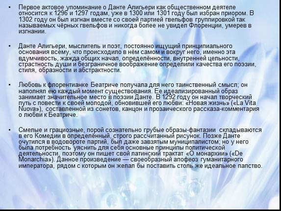 Данте Алигьери, мыслитель и поэт, постоянно ищущий принципиального основания всему, что происходило в нём самом и вокруг него, именно эта вдумчивость, жажда общих начал, определённости, внутренней цельности, страстность души и безграничное воображение определили качества его поэзии, стиля, образности и абстрактности.
