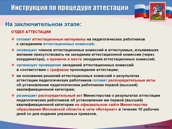 размещает распорядительный акт Министерства о результатах аттестации педагогических работников об установлении им первой (высшей) квалификационной категории на официальном сайте Министерства образования Московской области в сети «Интернет» в течение 10 рабочих дней со дня издания указанных приказов.