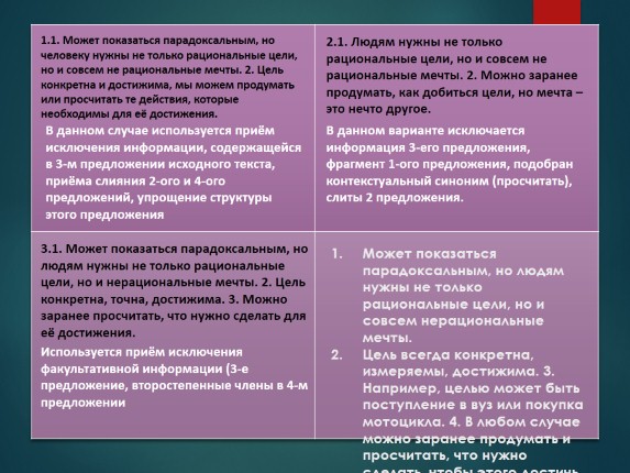3.1. Может показаться парадоксальным, но людям нужны не только рациональные цели, но и нерациональные мечты. 2. Цель конкретна, точна, достижима. 3. Можно заранее просчитать, что нужно сделать для её достижения.