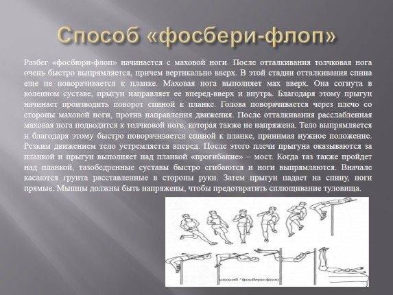 Разбег «фосбюри-флоп» начинается с маховой ноги. После отталкивания толчковая нога очень быстро выпрямляется, причем вертикально вверх. В этой стадии отталкивания спина еще не поворачивается к планке. Маховая нога выполняет мах вверх. Она согнута в коленном суставе, прыгун направляет ее вперед-вверх и внутрь. Благодаря этому прыгун начинает производить поворот спиной к планке. Голова поворачивается через плечо со стороны маховой ноги, против направления движения. После отталкивания расслабленная маховая нога подводится к толчковой ноге, которая также не напряжена. Тело выпрямляется и благодаря этому быстро поворачивается спиной к планке, принимая нужное положение. Резким движением тело устремляется вперед. После этого плечи прыгуна оказываются за планкой и прыгун выполняет над планкой «прогибание» – мост. Когда таз также пройдет над планкой, тазобедренные суставы быстро сгибаются и ноги выпрямляются. Вначале касаются грунта расставленные в стороны руки. Затем прыгун падает на спину, ноги прямые. Мышцы должны быть напряжены, чтобы предотвратить сплющивание туловища.