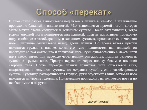 Разбег выполняется под углом 25 — 35° к планке. Отталкивание производится ближней к планке ногой. Взлет по технике такой же, как и в способе «перекат». Мах выполняется прямой ногой широко и свободно, создавая уже в начальной стадии взлета вращательный момент. Обе руки, слегка согнутые в локтях, поднимаются одновременно с маховой ногой. Плечи и туловище отводятся назад, прыгун принимает положение вдоль планки, грудью к ней. Толчковая нога сгибается в коленном и тазобедренном суставах, колено отводится в сторону кнаружи, пятка приближается к колену маховой ноги. Прыгун переходит через планку грудью и животом. За счет движения маховой ноги и отведения толчковой ноги кнаружи создается вращательный момент вокруг планки. Взлетев над ней, прыгун опускает маховую руку и плечо за планку, а противоположное плечо и руку отводит в сторону и назад за спину. Одновременно с этим отводится колено толчковой ноги, маховая нога несколько опускается за планку. Приземление осуществляется на маховые ногу и руку, или на маховую часть тела прыгуна, или, при сильном вращательном моменте, на спину.
