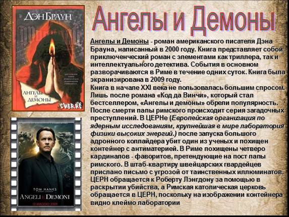 Ангелы и Демоны - роман американского писателя Дэна Брауна, написанный в 2000 году. Книга представляет собой приключенческий роман с элементами как триллера, так и интеллектуального детектива. События в основном разворачиваются в Риме в течение одних суток. Книга была экранизирована в 2009 году.