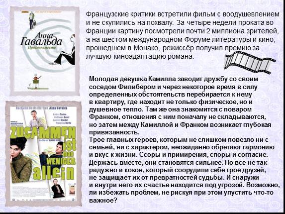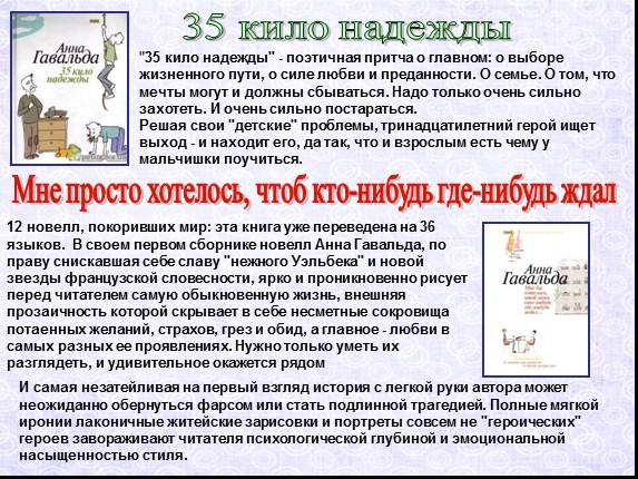 В 1999 году вышла книга Анны Гавальды "Мне бы хотелось, чтоб меня кто-нибудь где-нибудь ждал…", удостоенная в 2000 году Гран-при RTL. Этот сборник новелл в течение следующих четырех лет был переведен почти на 30 языков и принес своему автору славу новой звезды французской словесности.