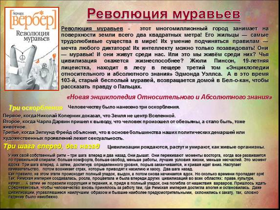 Революция муравьев - этот многомиллионный город занимает на поверхности земли всего два квадратных метра! Его жильцы — самые трудолюбивые существа в мире! Их умение подчиняться правилам — мечта любого диктатора! Их интеллекту можно только позавидовать! Они — муравьи! И они живут среди нас. Или это мы живём среди них? Чья цивилизация окажется жизнеспособнее? Жюли Пинсон, 19-летняя лицеистка, находит в лесу в пещере третий том «Энциклопедии относительного и абсолютного знания» Эдмонда Уэллса. А в это время 103-й, старый бесполый муравей, возвращается домой в Бел-о-кан, чтобы рассказать правду о Пальцах.