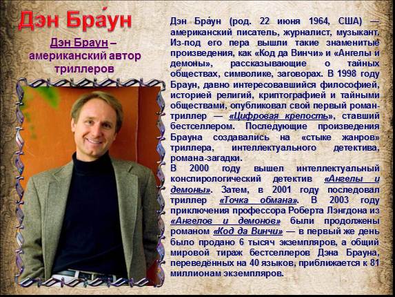 Дэн Бра́ун (род. 22 июня 1964, США) — американский писатель, журналист, музыкант. Из-под его пера вышли такие знаменитые произведения, как «Код да Винчи» и «Ангелы и демоны», рассказывающие о тайных обществах, символике, заговорах. В 1998 году Браун, давно интересовавшийся философией, историей религий, криптографией и тайными обществами, опубликовал свой первый роман-триллер — «Цифровая крепость», ставший бестселлером. Последующие произведения Брауна создавались на «стыке жанров» триллера, интеллектуального детектива, романа-загадки.