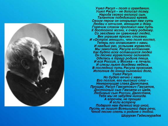 Ушел Расул – поэт и гражданин. Ушел Расул – не дописал поэму. Народа своего великий сын, Талантом победивший время. Своим пером он открывал нам суть Любви к отчизне, женщине и дому. Горячим словом проложил нам путь К достойной жизни, к очагу родному. Со звездами он сравнивал людей, Век украшая яркими стихами. И «Остров женщин», что поэт воспел, Теперь его оплакивает с нами, И каждый раз, услышав журавлей, Мы замолчим, Расула вспоминая. Как будто всех оставшихся людей Он песней журавлиной окликает. Оделась в траур родина певца, И вся Россия, и Москва – в печали. И слезы льют дождями небеса, В последний путь Расула провожая. Исполнив до конца сыновний долг, Ушел Расул. Но будет вечно с нами Его поэзия, его высокий слог – Немеркнущая слава Дагестана. Прощай, Расул Гамзатович Гамзатов, Достойный сын Гамзата из Цада, Любимый сын России, Дагестана, Тебя мы не забудем никогда. А впрочем, не прощай И если встречу Подарит нам далекий мир иной, Пусть не лишит Всевышний дара речи, Чтоб песню спеть о родине с тобой.