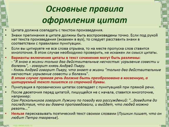 Варианты включения цитаты в текст сочинения могут быть различны: - "Я знаю в жизни только два действительные несчастья: угрызение совести и болезнь", - говорит князь Андрей Пьеру. - Князь Андрей говорит Пьеру, что знает в жизни "только два действительные несчастья: угрызение совести и болезнь". В этом случае прямая речь должна быть преобразована в косвенную, а цитируемый текст пишется со строчной буквы.