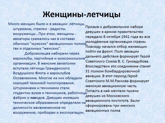Призыв о добровольном наборе девушек в армию правительство передало 8 октября 1941 года во все молодѐжные организации страны. Повсюду начался отбор желающих пойти на фронт. Полк авиации дальнего действия формирует Герой Советского Союза В. С. Гризадубова. Впоследствии это соединение станет 31 полком бомбардировочной авиации. В этот период Герой Советского М.М.Раскова формирует женскую авиационную часть. Попасть в неѐ мечтали тысячи девушек из Московского авиационного института. Были сформированы три женских авиационных полка