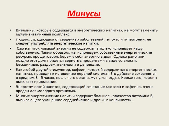 Энергетические напитки противопоказаны при гипертонии, заболеваниях сердечно - сосудистой системы, глаукоме, нарушении сна, повышенной возбудимости и чувствительности к кофеину.