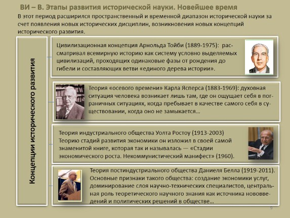 В этот период расширился пространственный и временной диапазон исторической науки за счет появления новых исторических дисциплин, возникновения новых концепций исторического развития.