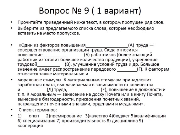«Один из факторов повышения_________________(А) труда — совершенствование организации труда. Сюда относится повышение__________ (Б) работников (более знающий работник изготовит большее количество продукции), укрепление трудовой_________ (В), улучшение условий труда и др. Большое значение имеет распространение передового ________(Г). К факторам относятся также материальные и