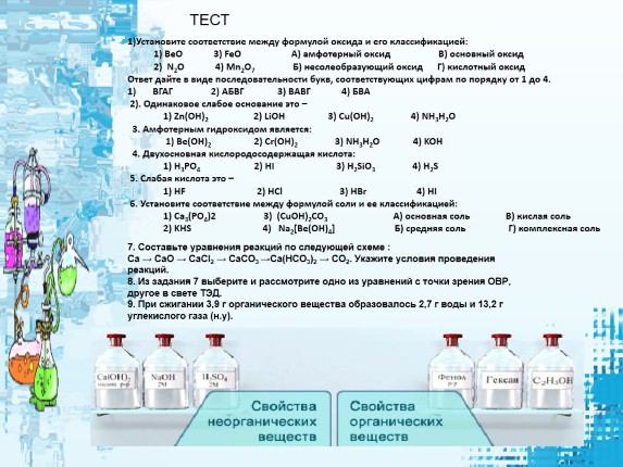 1) BeO 3) FeO А) амфотерный оксид В) основный оксид