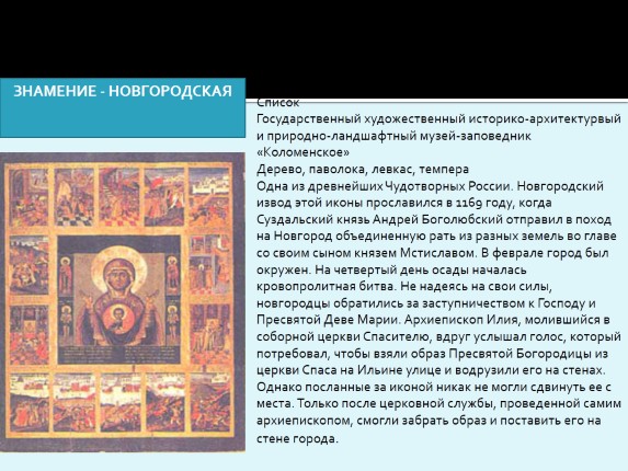 Одна из древнейших Чудотворных России. Новгородский извод этой иконы прославился в 1169 году, когда Суздальский князь Андрей Боголюбский отправил в поход на Новгород объединенную рать из разных земель во главе со своим сыном князем Мстиславом. В феврале город был окружен. На четвертый день осады началась кровопролитная битва. Не надеясь на свои силы, новгородцы обратились за заступничеством к Господу и Пресвятой Деве Марии. Архиепископ Илия, молившийся в соборной церкви Спасителю, вдруг услышал голос, который потребовал, чтобы взяли образ Пресвятой Богородицы из церкви Спаса на Ильине улице и водрузили его на стенах. Однако посланные за иконой никак не могли сдвинуть ее с места. Только после церковной службы, проведенной самим архиепископом, смогли забрать образ и поставить его на стене города.