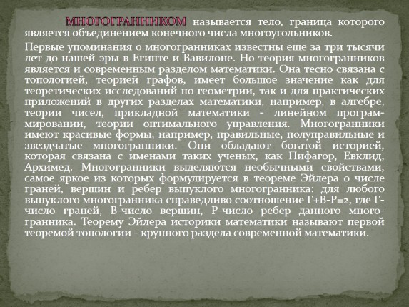 Первые упоминания о многогранниках известны еще за три тысячи лет до нашей эры в Египте и Вавилоне. Но теория многогранников является и современным разделом математики. Она тесно связана с топологией, теорией графов, имеет большое значение как для теоретических исследований по геометрии, так и для практических приложений в других разделах математики, например, в алгебре, теории чисел, прикладной математики - линейном програм-мировании, теории оптимального управления. Многогранники имеют красивые формы, например, правильные, полуправильные и звездчатые многогранники. Они обладают богатой историей, которая связана с именами таких ученых, как Пифагор, Евклид, Архимед. Многогранники выделяются необычными свойствами, самое яркое из которых формулируется в теореме Эйлера о числе граней, вершин и ребер выпуклого многогранника: для любого выпуклого многогранника справедливо соотношение Г+В-Р=2, где Г-число граней, В-число вершин, Р-число ребер данного много-гранника. Теорему Эйлера историки математики называют первой теоремой топологии - крупного раздела современной математики.