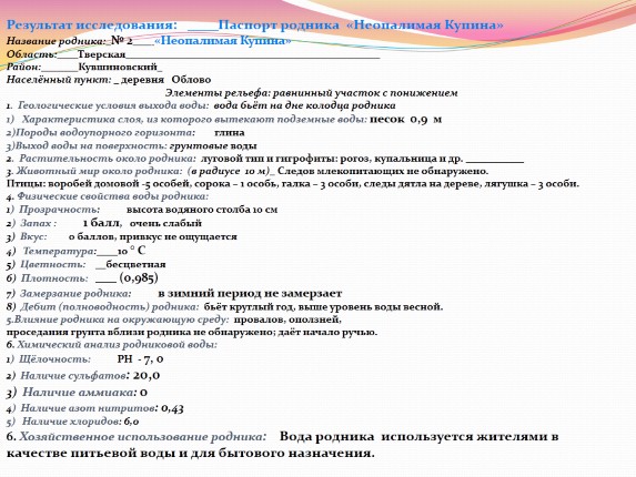 Результат исследования: Паспорт родника «Неопалимая Купина»
