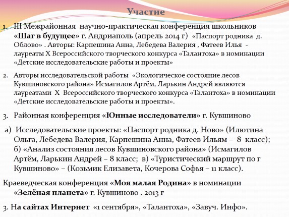 а) Исследовательские проекты: «Паспорт родника д. Ново» (Илютина Ольга, Лебедева Валерия, Карпешина Анна, Фатеев Ильям – 8 класс); б) «Анализ состояния лесов Кувшиновского района» (Исмагилов Артём, Ларькин Андрей – 8 класс; в) «Туристический маршрут по г Кувшиново» – (Козьмик Елизавета, Кочерова Софья – 11 класс).