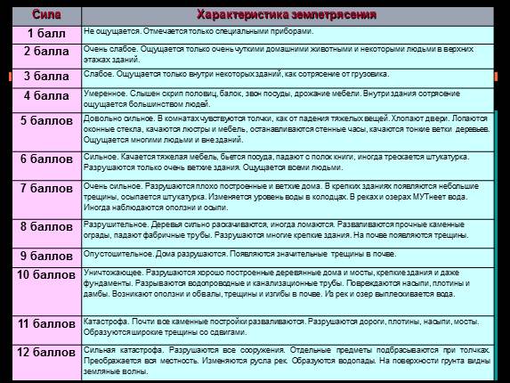 12 баллов Сильная катастрофа. Разрушаются все сооружения. Отдельные предметы подбрасываются при толчках. Преображается вся местность. Изменяются русла рек. Образуются водопады. На поверхности грунта видны земляные волны.