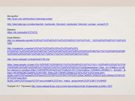 Фоторобот http://jouk.com.ua/fotorobot-cheloveka-onlajn/ http://skachatprogu.ru/index/skachat_mentovskij_fotorobot_mentovskij_fotorobot_polnaja_versija/0-53 Мимика https://vk.com/public57219722 Анри Матисс http://ru.wikipedia.org/wiki/%D0%9C%D0%B0%D1%82%D0%B8%D1%81%D1%81,_%D0%90%D0%BD%D1%80%D0%B8 http://megabook.ru/media/%D0%9C%D0%90%D0%A2%D0%98%D0% A1%D0%A1%20%D0%90%D0%BD%D1%80%D0%B8%20(%D0%96%D0%B5%D0%BD%D1%81%D0%BA%D0%B8%D0%B9%20%D0%BF%D0%BE%D1%80%D1%82%D1%80%D0%B5%D1%82) http://www.vangogh.ru/study/book1/06.php https://www.google.ru/search?q=%D0%BC%D0%B0%D1%82%D0%B8%D1%81%D1%81+%D0%B0%D0%B2%D1%82%D0%BE%D0%BF%D0%BE%D1%80%D1%82%D1%80%D0%B5%D1%82&newwindow=1&es_sm=93&tbm=isch&tbo=u&source=univ&sa=X&ei=IVxKU9PRG4fJ4wScjoDYDg&ved=0CCUQsAQ&biw=1280&bih=880#facrc=_&imgdii=_&imgrc=IKU8WIkZNOGgBM%253A%3B0_Wdsu32b1TN5M%3Bhttp%253A%252F%252Fwww.dom-studio.com%252Fupload%252Fiblock%252F991%252F991131f70207cd26ac3d06b5c385b828.jpg%3Bhttp%253A%252F%252Fwww.dom-studio.com%252Fessays%252Frassuzhdalki%252Fanri_matiss_avtoportret%252F%3B313%3B400 Портрет А.С. Пушкина http://www.wikipaintings.org/ru/orest-kiprensky/portrait-of-alexander-pushkin-1827