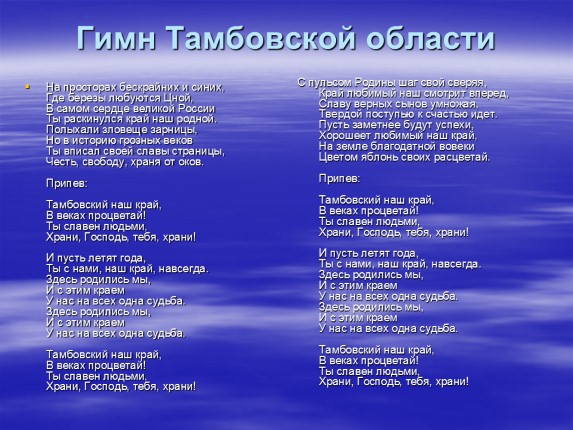 На просторах бескрайних и синих, Где березы любуются Цной, В самом сердце великой России Ты раскинулся край наш родной. Полыхали зловеще зарницы, Но в историю грозных веков Ты вписал своей славы страницы, Честь, свободу, храня от оков. Припев: Тамбовский наш край, В веках процветай! Ты славен людьми, Храни, Господь, тебя, храни! И пусть летят года, Ты с нами, наш край, навсегда. Здесь родились мы, И с этим краем У нас на всех одна судьба. Здесь родились мы, И с этим краем У нас на всех одна судьба. Тамбовский наш край, В веках процветай! Ты славен людьми, Храни, Господь, тебя, храни!