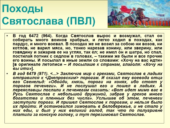 В год 6472 (964). Когда Святослав вырос и возмужал, стал он собирать много воинов храбрых, и легко ходил в походах, как пардус, и много воевал. В походах же не возил за собою ни возов, ни котлов, не варил мяса, но, тонко нарезав конину, или зверину, или говядину и зажарив ее на углях, так ел; не имел он и шатра, но спал, постилая потник с седлом в головах, – такими же были и все прочие его воины. И посылал в иные земли со словами: «Хочу на вас идти» [в оригинале летописи – И посылаше к странам, глаголя: «Хочу на вы ити»].