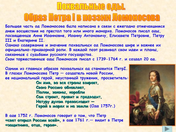- Похвальные оды: образ ПетраI, образ Елизаветы, образ Родины;