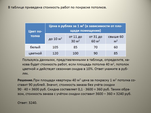 Решение.При площади квартиры 40 м2 цена за покраску 1 м2 потолка составит 90 рублей. Значит, стоимость заказа без учёта скидки 90 · 40 = 3600 руб. Скидка составляет 0,1 · 3600 = 360 руб. Таким образом, стоимость заказа с учётом скидки составит 3600 − 360 = 3240 руб.