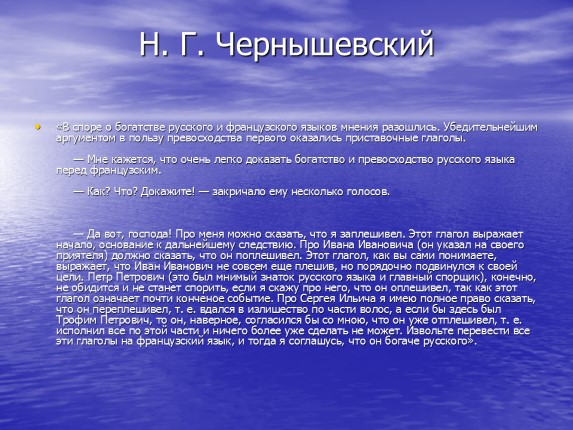 «В споре о богатстве русского и французского языков мнения разошлись. Убедительнейшим аргументом в пользу превосходства первого оказались приставочные глаголы. — Мне кажется, что очень легко доказать богатство и превосходство русского языка перед французским. — Как? Что? Докажите! — закричало ему несколько голосов. — Да вот, господа! Про меня можно сказать, что я заплешивел. Этот глагол выражает начало, основание к дальнейшему следствию. Про Ивана Ивановича (он указал на своего приятеля) должно сказать, что он поплешивел. Этот глагол, как вы сами понимаете, выражает, что Иван Иванович не совсем еще плешив, но порядочно подвинулся к своей цели. Петр Петрович (это был мнимый знаток русского языка и главный спорщик), конечно, не обидится и не станет спорить, если я скажу про него, что он оплешивел, так как этот глагол означает почти конченое событие. Про Сергея Ильича я имею полное право сказать, что он переплешивел, т. е. вдался в излишество по части волос, а если бы здесь был Трофим Петрович, то он, наверное, согласился бы со мною, что он уже отплешивел, т. е. исполнил все по этой части и ничего более уже сделать не может. Извольте перевести все эти глаголы на французский язык, и тогда я соглашусь, что он богаче русского».