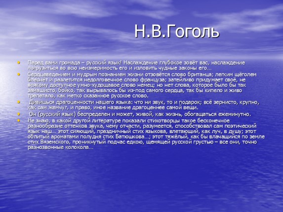Перед вами громада – русский язык! Наслаждение глубокое зовёт вас, наслаждение погрузиться во всю неизмеримость его и изловить чудные законы его…