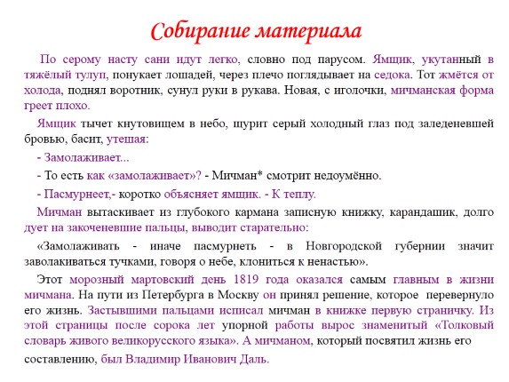 (В тексте есть две больших части: в одной рисуется эпизод из жизни В.И. Даля, в другой - даются необходимые пояснения: сообщается, кто этот седок, которого везет на легких санях по насту ямщик, какую роль в жизни мичмана сыграет этот день.)