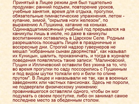 Принятый в Лицее режим дня был тщательно продуман: ранний подъем, повторение уроков, учебные занятия, время для отдыха, прогулки, обязательные гимнастические упражнения, летом - купание, зимой, "окрылив ноги железом", по выражению А.Пушкина, катание на коньках. Одиннадцатимесячный учебный год прерывался на каникулы лишь в июле, но даже в каникулы воспитанники оставались в Царском Селе. Родным разрешалось посещать Лицей в праздничные и воскресные дни. Строгий надзор гувернеров не мешал "избранным сынам дворянства", как называл их Куницын, шалить, проказничать, и тогда в журнале поведения появлялись такие записи: "Малиновский, Пущин и Илличевский оставили без ужина за то, что во время прогулки по саду поссорились с Пушкиным и под видом шутки толкали его и били по спине прутом". В Лицее и наказывали не так, как в военных заведениях или частных пансионах. Здесь не пороли, не подвергали физическому унижению: провинившегося оставляли одного, чтобы он мог подумать о своем проступке, либо он занимал самое последнее место за обеденным столом.