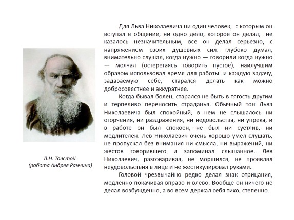 Когда бывал болен, старался не быть в тягость другим и терпеливо переносить страданья. Обычный тон Льва Николаевича был спокойный; в нем не слышалось ни огорчения, ни раздражения, ни недовольства, ни упрека, и в работе он был спокоен, не был ни суетлив, ни медлителен. Лев Николаевич очень хорошо умел слушать, не пропускал без внимания ни смысла, ни выражений, ни жестов говорившего и запоминал слышанное. Лев Николаевич, разговаривая, не морщился, не проявлял неудовольствия в лице и не жестикулировал руками.