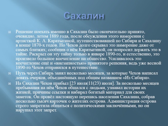 Решение поехать именно в Сахалин было окончательно принято, очевидно, летом 1889 года, после обсуждения этого намерения с артисткой К. А. Каратыгиной, путешествовавшей по Сибири и Сахалину в конце 1870-х годов. Но Чехов долго скрывал это намерение даже от самых близких; сообщив о нём Каратыгиной, он попросил держать это в тайне. Раскрыл он эту тайну только в январе 1890-го, и естественно, это произвело большое впечатление на общество. Усиливалось это впечатление ещё и «внезапностью» принятого решения, ведь уже весной 1890-го Чехов отправился в путешествие.