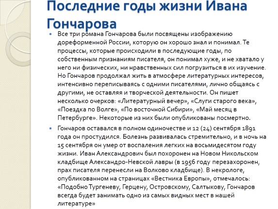 Все три романа Гончарова были посвящены изображению дореформенной России, которую он хорошо знал и понимал. Те процессы, которые происходили в последующие годы, по собственным признаниям писателя, он понимал хуже, и не хватало у него ни физических, ни нравственных сил погрузиться в их изучение. Но Гончаров продолжал жить в атмосфере литературных интересов, интенсивно переписываясь с одними писателями, лично общаясь с другими, не оставляя и творческой деятельности. Он пишет несколько очерков: «Литературный вечер», «Слуги старого века», «Поездка по Волге», «По восточной Сибири», «Май месяц в Петербурге». Некоторые из них были опубликованы посмертно.