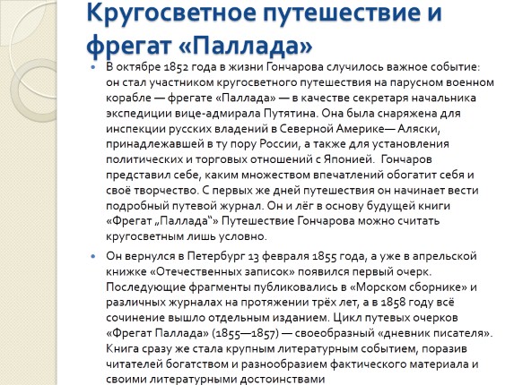 В октябре 1852 года в жизни Гончарова случилось важное событие: он стал участником кругосветного путешествия на парусном военном корабле — фрегате «Паллада» — в качестве секретаря начальника экспедиции вице-адмирала Путятина. Она была снаряжена для инспекции русских владений в Северной Америке— Аляски, принадлежавшей в ту пору России, а также для установления политических и торговых отношений с Японией. Гончаров представил себе, каким множеством впечатлений обогатит себя и своё творчество. С первых же дней путешествия он начинает вести подробный путевой журнал. Он и лёг в основу будущей книги «Фрегат „Паллада“» Путешествие Гончарова можно считать кругосветным лишь условно.