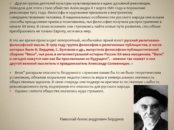 Другая группа деятелей культуры культивировала к идею духовной революции. Поводом для этого стало убийство Александра II 1 марта 1881 года и поражение революции 1905 года. Философы и художники призывали к внутреннему совершенствованию человека. В национальных особенностях русского народа они искали способы преодоления кризиса позитивизма, чья философия получила распространение в начале XX века. В своих исканиях они стремились найти новые пути развития, способные преобразовать не только Европу, но и весь мир. В это же время происходит невероятный, необычайно яркий взлет русской религиозно-философской мысли. В 1909 году группа философов и религиозных публицистов, в числе которых были Н. Бердяев, С. Булгаков и др., выпустила философско-публицистический сборник "Вехи", чья роль в интеллектуальной истории России XX века неоценима. "Вехи" и сегодня кажутся нам как бы присланными из будущего", - именно так скажет о них другой великий мыслитель и правдоискатель Александр Солженицын. «