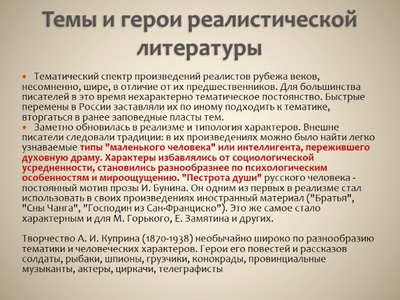 Заметно обновилась в реализме и типология характеров. Внешне писатели следовали традиции: в их произведениях можно было найти легко узнаваемые типы "маленького человека" или интеллигента, пережившего духовную драму. Характеры избавлялись от социологической усредненности, становились разнообразнее по психологическим особенностям и мироощущению. "Пестрота души" русского человека - постоянный мотив прозы И. Бунина. Он одним из первых в реализме стал использовать в своих произведениях иностранный материал ("Братья", "Сны Чанга", "Господин из Сан-Франциско"). Это же самое стало характерным и для М. Горького, Е. Замятина и других.