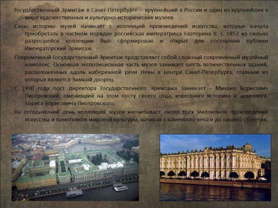 В центре Санкт-Петербурга, на набережной Невы, напротив Петропавловской крепости, расположен крупнейший в России музей – Государственный ордена Ленина Эрмитаж. В его коллекциях хранится около трех миллионов экспонатов – произведений живописи, скульптуры, графики, предметов прикладного искусства, монет, орденов и знаков, образцов оружия, археологических памятников и других ценностей, созданных многими народами мира с древнейших времен до наших дней.