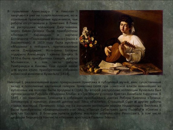 Николай I, реализовавший идею превращения Эрмитажа в публичный музей, внес существенный вклад в пополнение картинной галереи Эрмитажа (хотя при советской власти важнейшие из купленных им полотен были проданы в США). На второй распродаже коллекции Кузвельта был куплен шедевр Рафаэля «Мадонна Альба» и «Три Марии у склепа Христа» Аннибале Карраччи. В 1845 г по завещанию Татищева к собранию приобщились диптих Робера Кампена «Троица. Богоматерь у камина», ранний диптих ван Эйка «Распятие. Страшный Суд» и другие работы старых мастеров. Примерно тогда же на аукционе коллекции короля Нидерландов Виллема II были приобретены «Благовещение» ван Эйка, «Пьета» Себастьяно дель Пьомбо и «Снятие с креста» Госсарта. В Венеции купили работы мастеров итальянского Ренессанса, в том числе шедевры Тициана (в том числе «Несение креста») и Пальмы Веккьо.