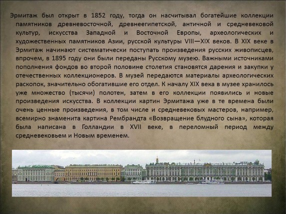 Эрмитаж был открыт в 1852 году, тогда он насчитывал богатейшие коллекции памятников древневосточной, древнеегипетской, античной и средневековой культур, искусства Западной и Восточной Европы, археологических и художественных памятников Азии, русской культуры VIII—XIX веков. В XIX веке в Эрмитаж начинают систематически поступать произведения русских живописцев, впрочем, в 1895 году они были переданы Русскому музею. Важными источниками пополнения фондов во второй половине столетия становятся дарения и закупки у отечественных коллекционеров. В музей передаются материалы археологических раскопок, значительно обогатившие его отдел. К началу XIX века в музее хранилось уже множество (тысячи) полотен, затем в его коллекции появились и новые произведения искусства. В коллекции картин Эрмитажа уже в те времена были очень ценные произведения, в том числе и средневековых мастеров, например, всемирно знаменита картина Рембрандта «Возвращение блудного сына», которая была написана в Голландии в XVII веке, в переломный период между средневековьем и Новым временем.