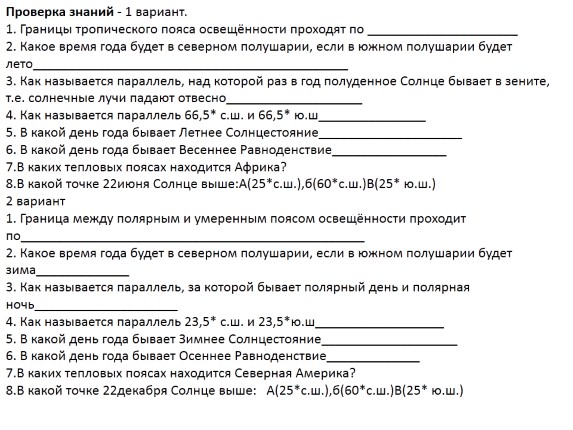 1. Граница между полярным и умеренным поясом освещённости проходит по________________________________________________